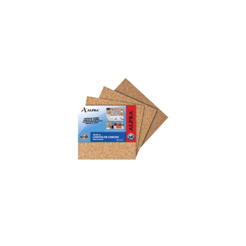 DescripciónARTÍCULO:TABLEROTIPO:DE CORCHOMODELO:6768MARCA:ALFRACOLOR:CaféCaracterísticasMaterial:Loseta de corchoMedidas:30x30x0.6 cmCaracteristicas especiales:Loseta de corcho ALFRA 30x30x0.6 cm, 4 losetas 100% corcho de 6mm grosor, corcho resistente al pinchado. grano de tamaño uniforme que permite un mayor compactado y una mejor sujecion de chinchetas, exClave:ALF-PIZ-6768PresentaciónCantidad:1 paquete de 4 piezas