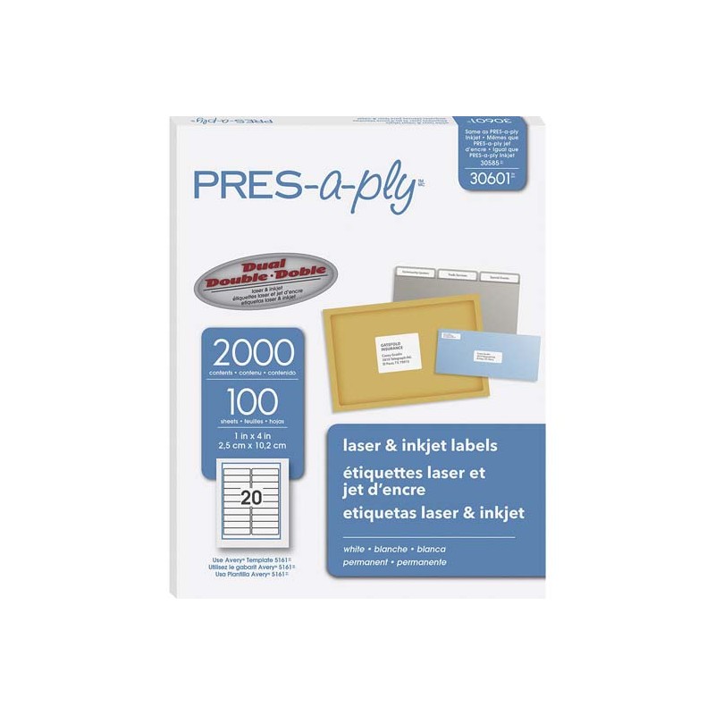 DescripciónARTÍCULO:ETIQUETAS LASERCOLOR:BLANCASMODELO:30601MARCA:AVERYMEDIDA:2.5X10.2 CMCaracterísticas BásicasDescripción:ETIQUETAS BLANCAS PRES-A-PLY 2.5 X 10.2 CMMarca:AVERYNo. de parte:30601Medidas:2.5 X 10.2Contenido / hoja:20Contenido / paquete:2000Color:BLANCACaracteristicas EspecificasTecnología de impresión:INYECCIÓN DE TINTA Y LÁSERPaís:MÉXICOCaja máster:5Otros:ECONÓMICA