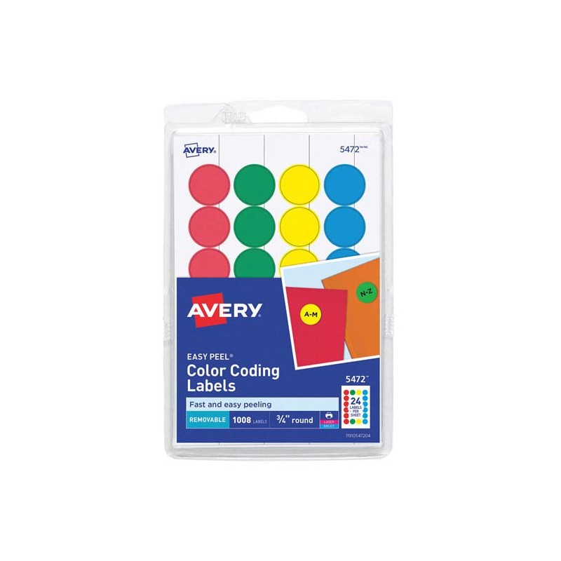 DescripciónARTÍCULO:ETIQUETAS CIRCULARESCOLOR:VARIOS COLORESMODELO:5472MARCA:AVERYMEDIDA:1.9 CM DE DIAMETROCaracterísticas BásicasDescripción:ETIQUETAS REDONDAS REMOVIBLES VARIOS COLORESMarca:AVERYNo. de parte:5472Medidas:1.9 DIAMETROContenido / hoja:24Contenido / paquete:816Color:VARIOSCaracteristicas EspecificasTecnología de impresión:INYECCIÓN DE TINTA Y LÁSERPaís:MÉXICOCaja máster:5Otros:REMOVIBLES