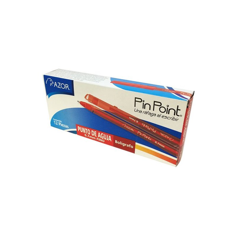 DescripciónARTÍCULO:BOLIGRAFOCOLOR:ROJOMODELO:PIN POINTMARCA:AZORTAMAÑO:PUNTO FINOCaracterísticasColor de la tinta:ROJOColor del barril:ROJOTipo de punto:FINORetráctil:NOTipo de tinta:PERMANENTEModelo:PIN POINTGrip:NOBorrable:NOTinta anti fraude:NOForma del cuerpo:CILINDRICOArtículos RelacionadosBoligrafos:N/AMarcadores:N/ARollers:N/APresentaciónPieza:N/ABlister:CAJA C/12 PIEZASCaja:N/ACorrugado:3.0