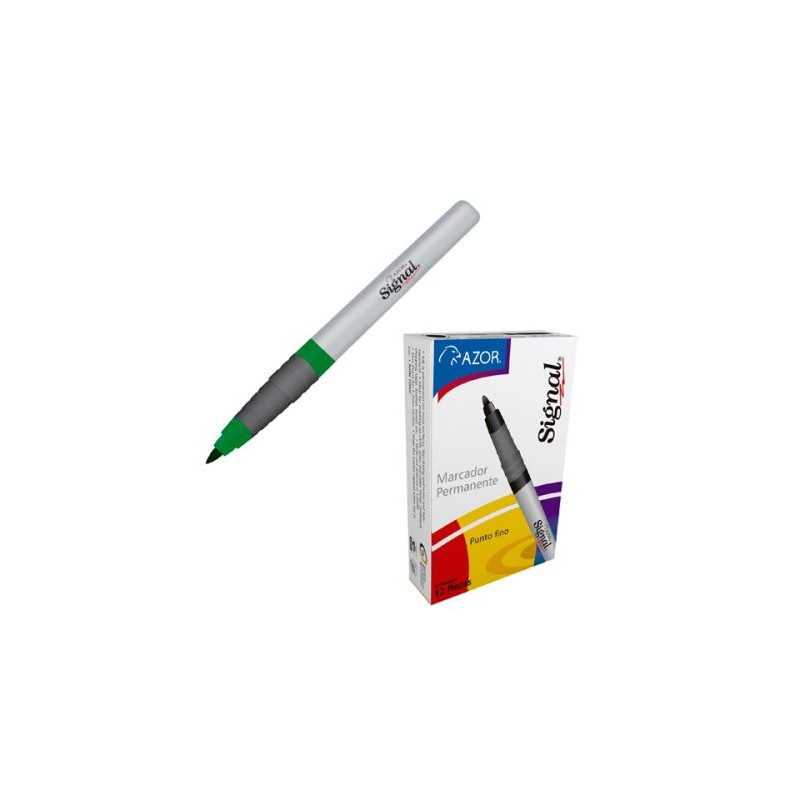 DescripciónARTÍCULO:MARCADORTIPO:PERMANENTECOLOR:VERDEMODELO:SIGNALMARCA:SIAZORGNALCaracterísticasTamaño:PUNTA 1.5 MMBarril:plasticoPunta:PUNTO FINOTapa:CERRADAContenido:CAJA 12 PIEZASMateriales:VIDRIO, PORCELANA, METAL, TELA, MADERA, plastico, CARTONCILLO. ETC.Artículos RelacionadosClave:301.30004PresentaciónColor de la tinta:VERDETipo de punta:PUNTA BALATipo de tinta:BASE ALCOHOLToxico:NO TÓXICORetráctil:NO APLICADepósito de tinta visible:NO APLICAClip:NO APLICAPizarron:NO APLICAGrip:GRIP AHULADO