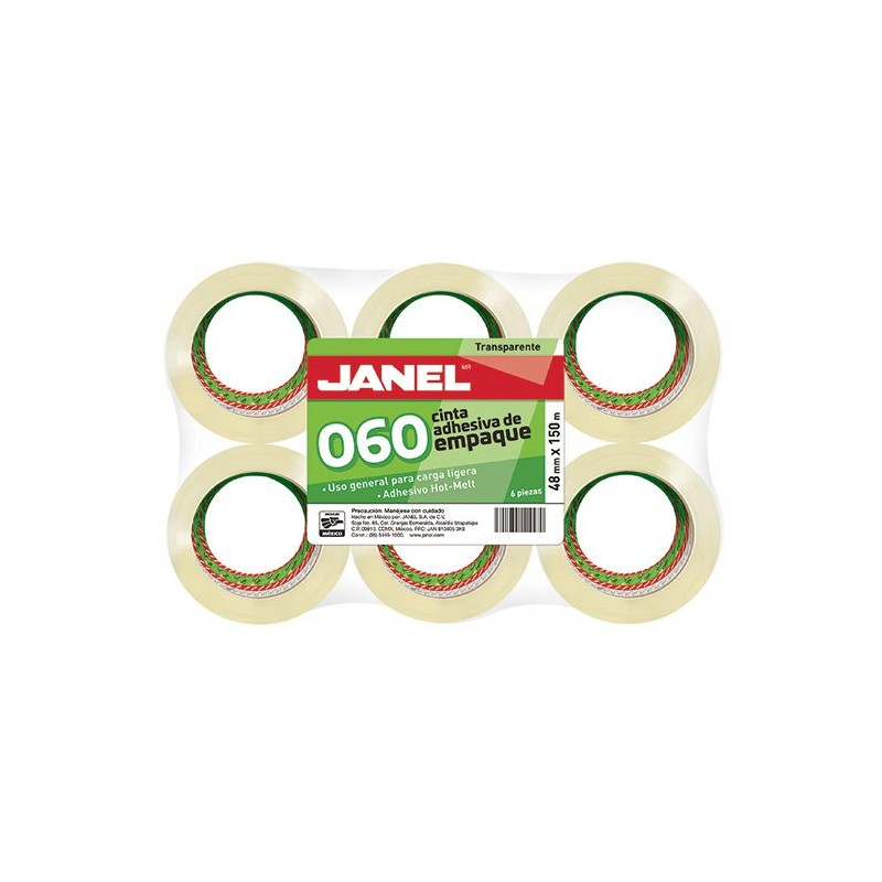DescripciónARTÍCULO:CINTA ADHESIVATIPO:DE EMPAQUECOLOR:TRANSPARENTEMODELO:65MARCA:JANELCaracterísticasClave:JAN-ADS-066T48XMedidas:48MM X 150MMaterial:RESPALDO: PELÍCULA DE POLIPROPILENO, ADHESIVO: HOT-MELTUso:CINTA DE EMPAQUE PARA CARGA LIGERAColor:TRASNPARENTEModelo:654815700Despachador:N/APresentación:BLISTER DE 6 PZASArtículos RelacionadosDespachador:N/ACinta adhesiva:CINTA EMPAQUE TRANSPARENTEPresentaciónBlister:6Master:6 PAQUETES CON 6 ROLLOS CADA UNOCorrugado:N/AFacturacion:BLISTER DE 6 PZAS