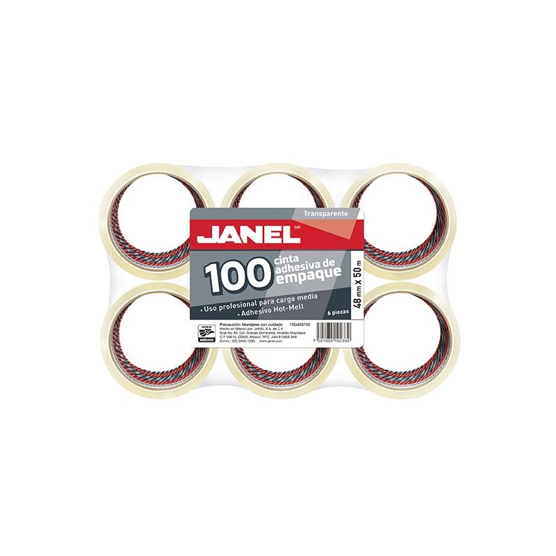 DescripciónARTÍCULO:CINTA ADHESIVATIPO:DE EMPAQUECOLOR:TRANSPARENTEMODELO:155MARCA:JANELCaracterísticasClave:JAN-ADS-15548X5Medidas:48MM X 50MMaterial:RESPALDO: PELÍCULA DE POLIPROPILENO, ADHESIVO: HOT-MELTUso:CINTA PARA CARGA MEDIA SENSITIVA A LA PRESIÓN, RESISTENTE A LA tension,Color:TRANSPARENTEModelo:1554850700Despachador:N/APresentación:BLISTER CON 6 PIEZASArtículos RelacionadosDespachador:N/ACinta adhesiva:linea 100 Y 080PresentaciónBlister:6 ROLLOSMaster:N/ACorrugado:36Facturacion:BLISTER CON 6 PIEZAS