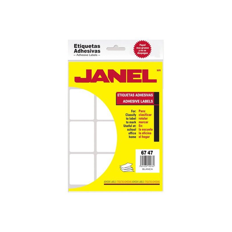DescripciónARTÍCULO:ETIQUETASCOLOR:BLANCASMODELO:NO.13MARCA:JANELMEDIDA:67X47 MMCaracterísticasClave:JAN-ETQ-13Medidas:67 X 47 MMMaterial:PAPELUso:ESCOLAR Y OFICINAColor:BLANCOModelo:13Despachador:N/APresentación:BOLSAArtículos RelacionadosDespachador:N/ACinta adhesiva:N/APresentaciónBlister:POR BOLSAMaster:20Corrugado:Facturacion:X BOLSA