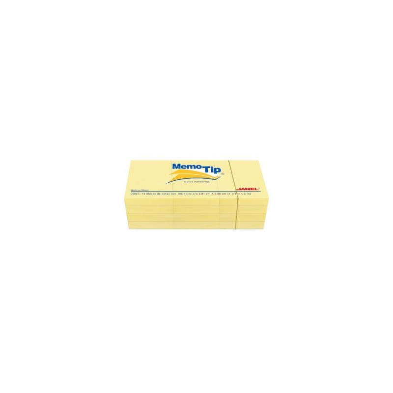 DescripciónARTÍCULO:NOTA ADHESIVATIPO:REMOVIBLEMODELO:MEMOTIPMARCA:JANELCOLOR:COLOR AMARILLOCaracteristicasMedidas:3.81 X 5.08 CMColor:AMARILLOBlock:PAQUTE CON 12 PIEZAS DE 100 HOJAS CADA UNAForma:RECTANGULARCaracterística especial:ADHESIVO REPOSICIONABLE.PresentaciónBlock:100 HOJASBlister:1 BLOCKCaja:288 BLOCKSCorrugado:N/A
