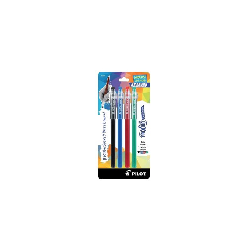 DescripciónEscribe, borra y repite con suavidad en vibrantes colores, borrador que no se desgasta, no se rompe, ni deja grumo, blister con 4 colores: negro, azul, rojo y verde, punto fino de 0.7 mmCaracterísticasColor de la tintaCOLORES SURTIDOS: NEGRO, AZUL, VERDE Y ROJOColor del barrilCOLOR DE LA TINTATipo de puntoPUNTO FINORetráctilNOTipo de tintaTINTA DE GEL BORRABLEModelo19151.0GripNOBorrableSITinta anti fraudeNOForma del cuerpoREDONDO