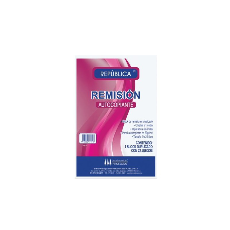 DescripciónARTêCULO:REMISIONMODELO:AEDCARACTERISTICAS:AUTOCOPIANTECONTENIDO:CON 22 JUEGOSUDM:-11CaracterísticasTamaño:ESQUELAColor:BLANCO/AZULAutocopiante:SIModelo:AEDNº de hojas:44.0